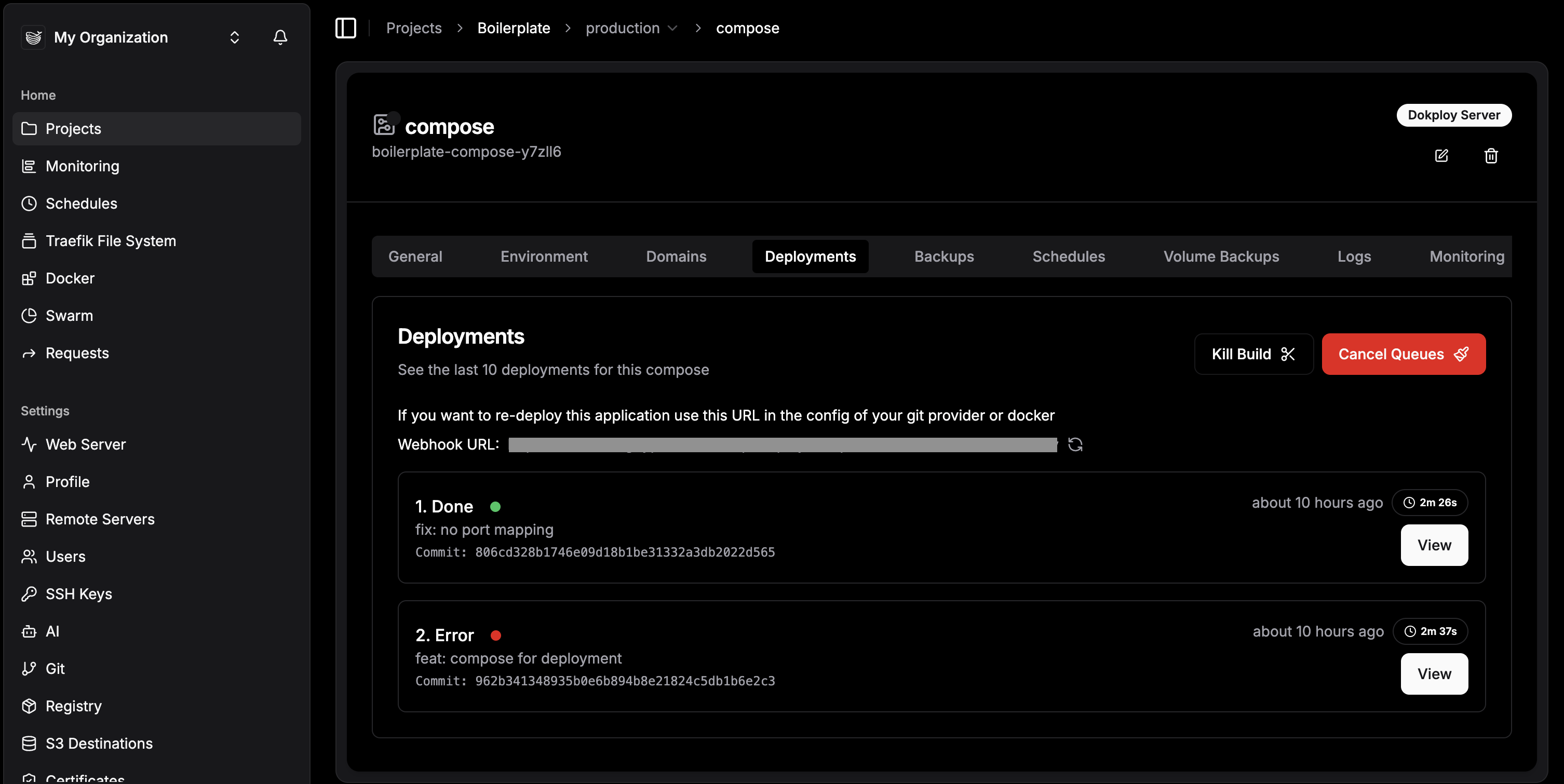 Switch to the Deployments tab. You will see the logs streaming in real-time. It will pull your repo, build the images defined in your